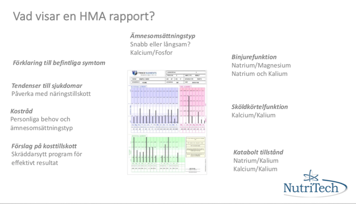 Hårmineralanalys ger mycket information om en människas unika näringsbehov, information som är svår att få från de flesta andra tester. Från testresultaten kan vi sätta individer i olika metaboliska kategorier. Det ger både information om vad personen behöver och vad den inte behöver, vilket kan vara väl så viktigt.